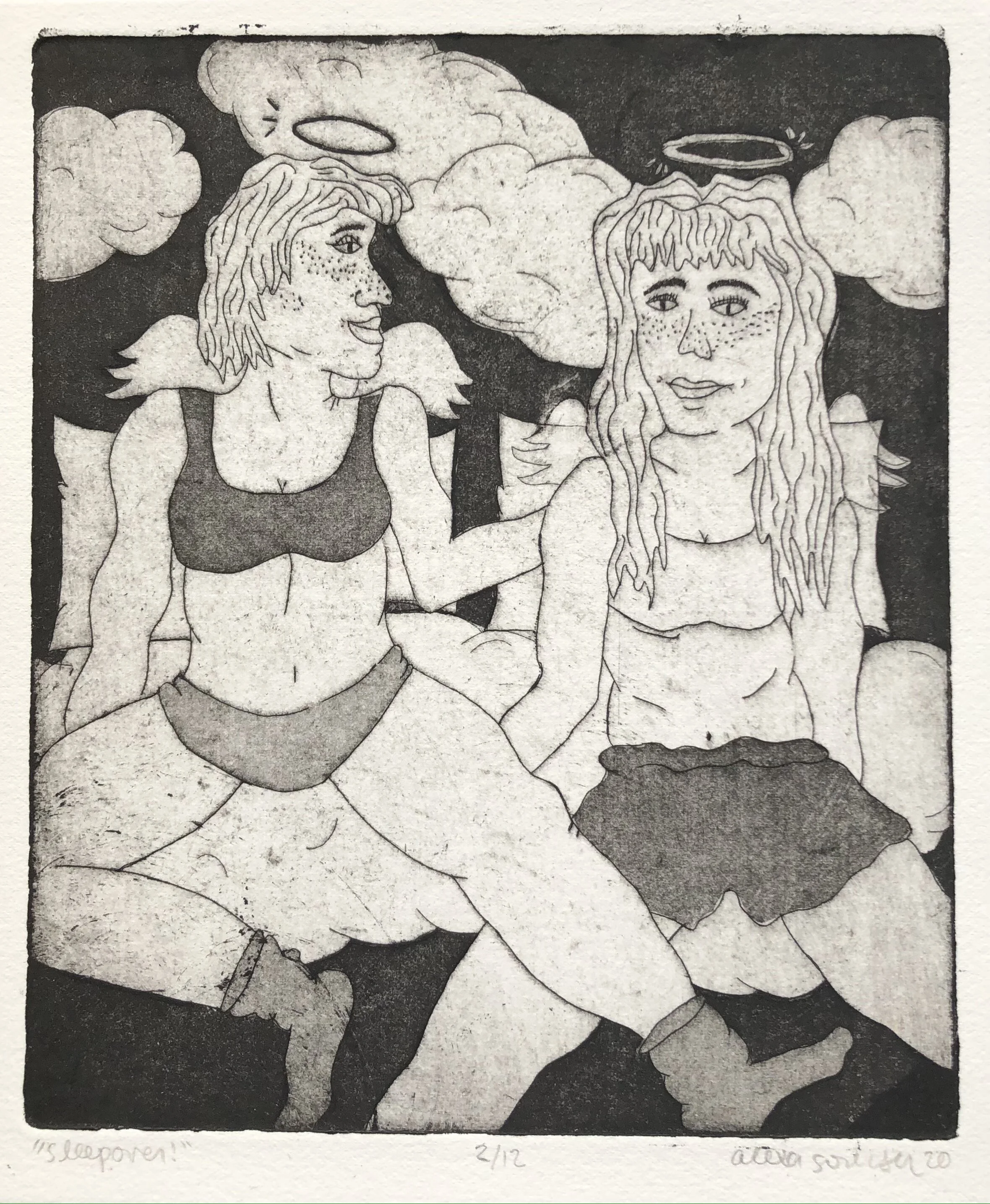 "sleepover!" prints Oct 16 Written By Alexa Kari September 2020, copper intaglio Alexa Kari https://alexa@alexakari.com